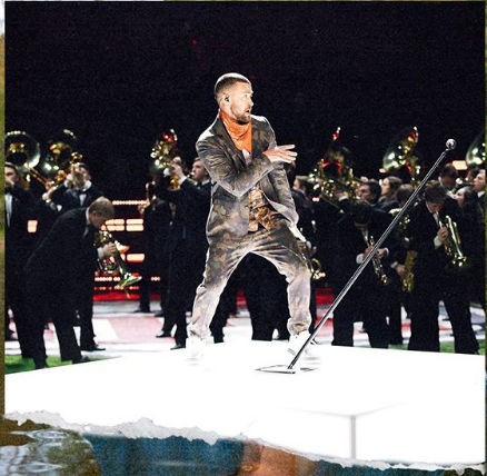 Timberlake opened his half-time performance with the first track off his new album, Filthy, which began under the stadium in what looked like a nightclub with strobe lights and an array of backup dancers. Sporting a leather jacket, camouflage trousers and a red bandana, he focused heavily on dance moves which were reminiscent of the moves from his Rock your Body music video. It is perhaps no surprise that this was his next song choice as he made his way down a runway from the stands onto the pitch, followed by his team of back-up dancers. Timberlake continued this blending of hits as he continued into Senorita to help him dance his way onto the main stage where his band, the Tennessee Kids were waiting.